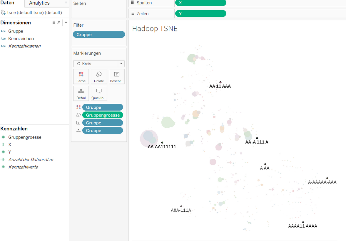 Dafür wurden die Kennzeichen in einem Feature Engineering abstrahiert, um nur die Abfolgen von Zahlen, Buchstaben, Sonderzeichen zu betrachten. So wurde z.B. aus „ME AB 123“ „AA AA 111“. Dadurch ließen sich die Kennzeichen in Gruppen gleicher Zeichenabfolgen zusammenlegen. Die Größe dieser Kennzeichengruppen und die Ähnlichkeit zueinander wurden dann mit einem Machine Learning Algorithmus visualisiert. Dabei lagen ähnliche Kennzeichengruppen in der Visualisierung nah beieinander.