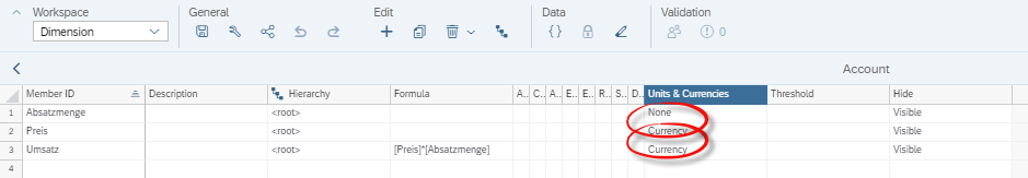 Ein weiterer wichtiger Punkt ist, dass bei der Migration von bestehenden Kontenmodellen die Eigenschaften der Einheit wegfallen. Auf dem alten Classic Account Model kann über die Dimension Account die Einheit & Währung eingestellt werden, wie in der Abbildung 3 zu sehen ist.