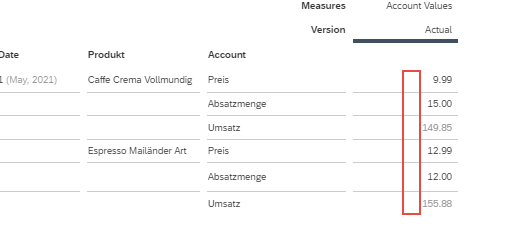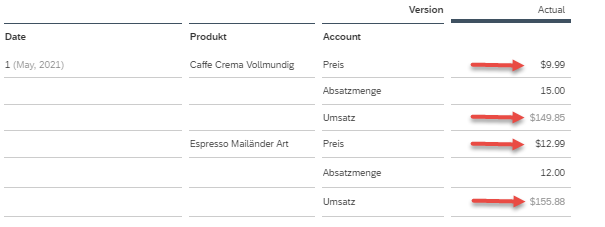 Eine Story auf diesem Modell zeigt auch die Einheiten & Währungen aus der Dimension Account entsprechend mit den Symbolen (siehe Abbildung 4).