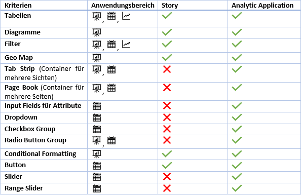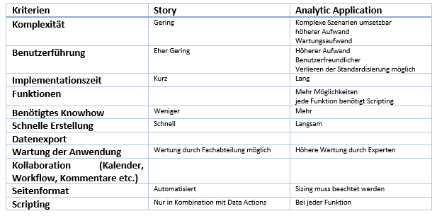 Ich empfehle nicht als Erstes zu überprüfen, ob eine Analytic Application Sinn ergibt, sondern ob es möglich ist, seine Anforderungen mit einer Story umzusetzen. Dadurch können Aufwände eingespart werden und man kommt nicht in Versuchungen seine Anforderungen komplexer zu machen, als sie eigentlich sind. Erst wenn es nicht möglich ist, seine Anforderungen umzusetzen, sollte man sich der Analytic Application zuwenden.